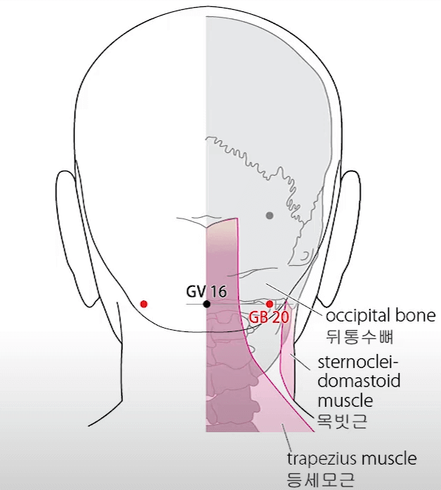 - 풍지혈 : 아래 그림을 참고해주세요. 빨간 점이 풍지혈입니다.